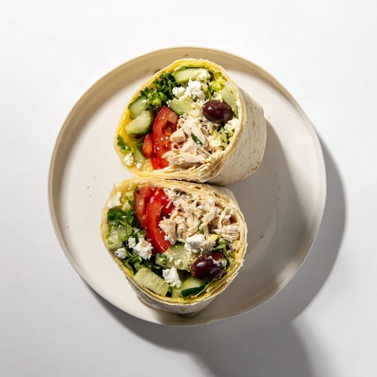 Enhance your wrap with a dollop of tzatziki or hummus for extra creaminess and flavor. This meal pairs wonderfully with a glass of crisp Sauvignon Blanc or sparkling water with a fresh lemon wedge.
