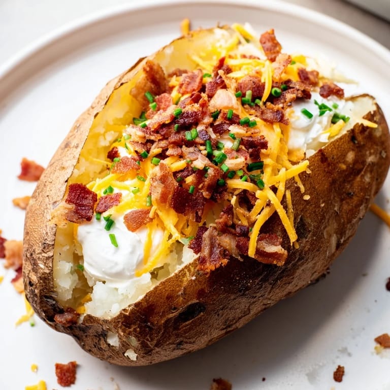 Save There's something almost meditative about baking potatoes—watching them transform from hard, pale ovals into golden, steaming pillows of comfort. My college roommate threw together loaded baked potatoes one winter evening when we had almost nothing in the dorm fridge except butter, cheese, and somehow, surprisingly fresh chives. That night, everyone gathered around, and suddenly this humble side dish became the main event. I've been refining it ever since, chasing that perfect balance of fluffy interior and crispy skin.