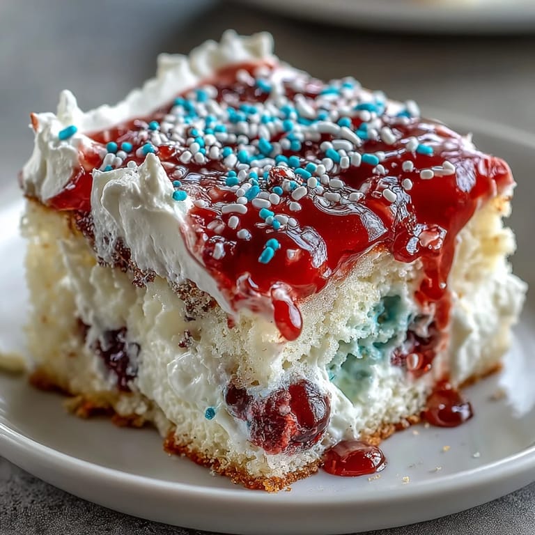 Save A burst of colors in the kitchen always energizes me, especially when a dessert transforms from simple to spirited before your eyes. When I first made this Memorial Day Red White Blue Poke Cake, music was playing and the sounds of summer drifted in through an open window—suddenly, the cake seemed to carry the season on its back. There's something quietly satisfying about poking holes into a fresh cake and pouring striped gelatin down into the crumbs, never knowing exactly how it will marble. The anticipation as it chills in the fridge is met only by the fun of decorating with sprinkles and berries, hands lightly dusted in sugar. By the time it sets, it's nearly impossible to resist sneaking a spoonful from the corner.