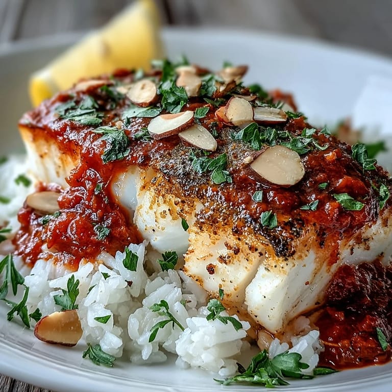Save My neighbor brought over a fillet of cod one Sunday evening, insisting I try roasting it with tomatoes instead of pan-frying. I was skeptical at first, used to my usual lemon and butter routine, but the moment that tomato sauce started bubbling around the fish in the oven, filling the kitchen with smoky paprika and garlic, I knew she was onto something. The spiced almonds were her secret finishing touch, a crunchy contrast that turned a simple weeknight dinner into something I actually looked forward to making again.